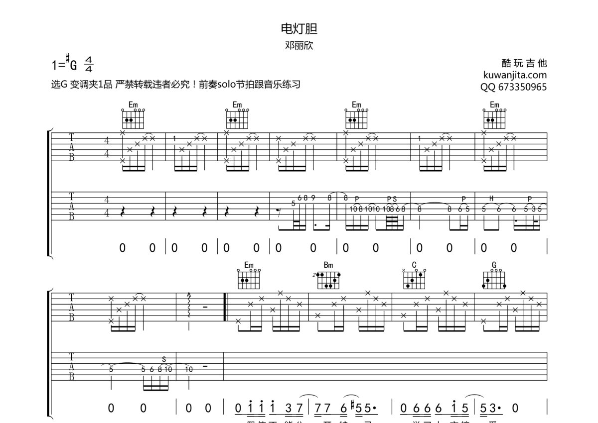 邓丽欣《电灯胆》吉他谱 - G调弹唱六线谱