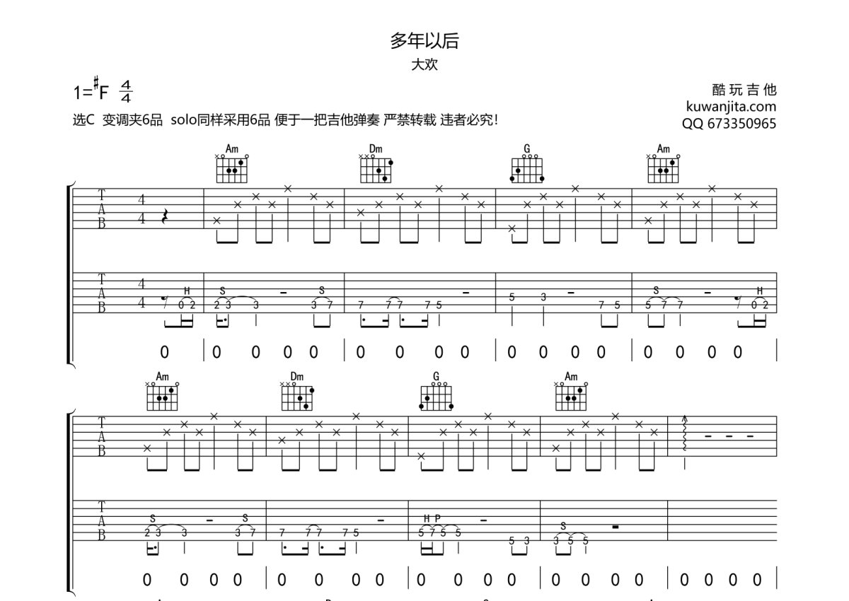 大欢《多年以后》吉他谱 - C调弹唱六线谱