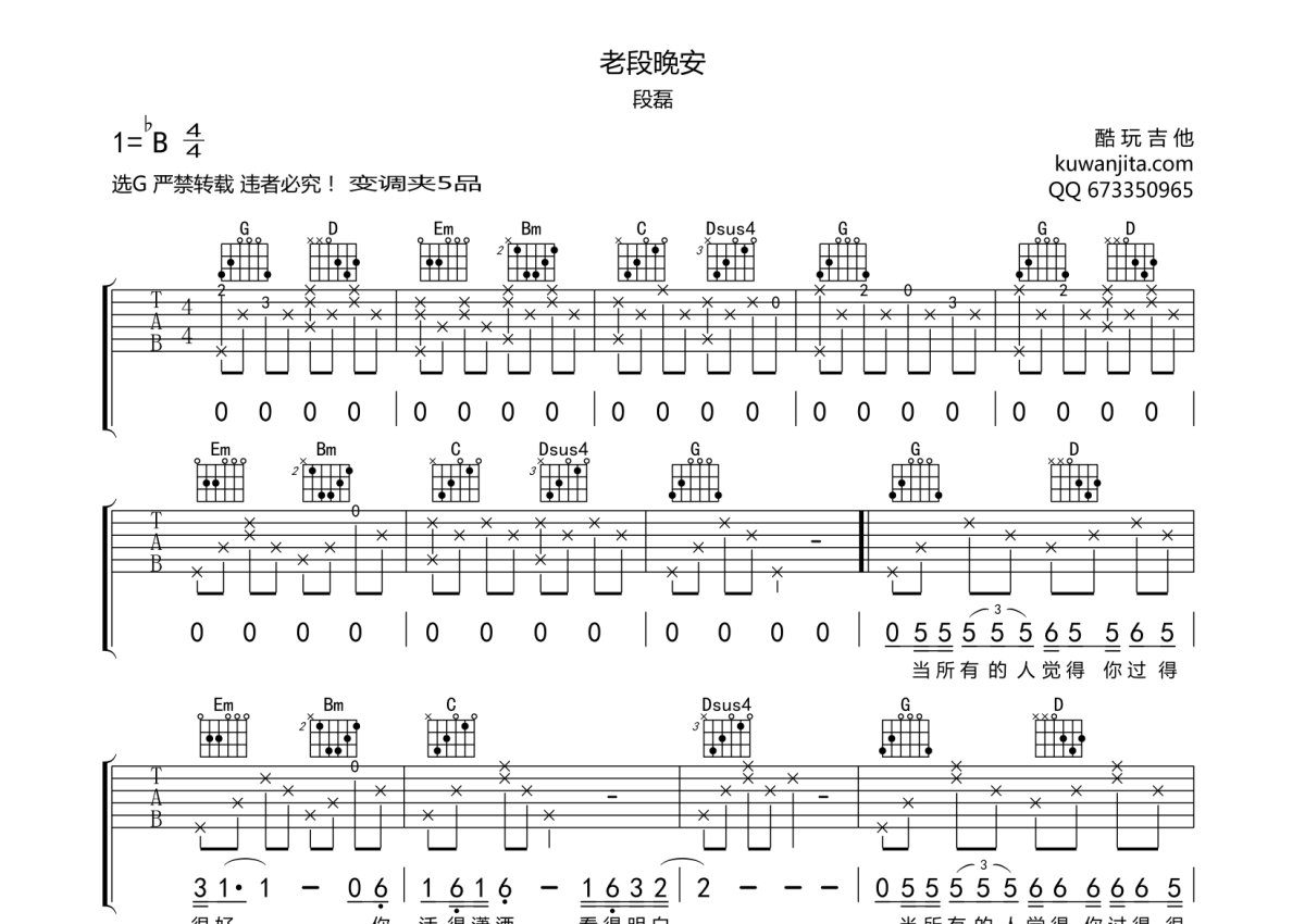 段磊《老段晚安》吉他谱 - G调弹唱六线谱