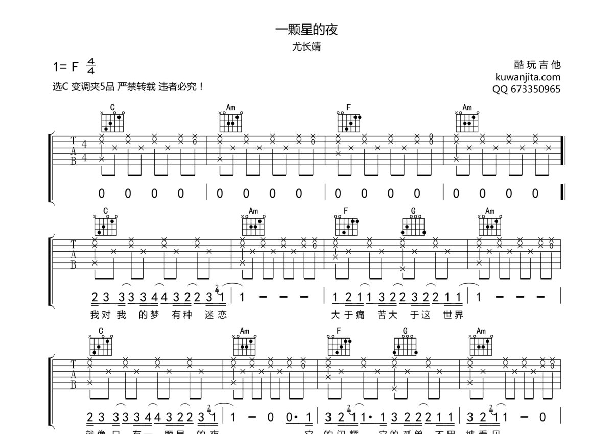 尤长靖《一颗星的夜》吉他谱 - C调弹唱六线谱