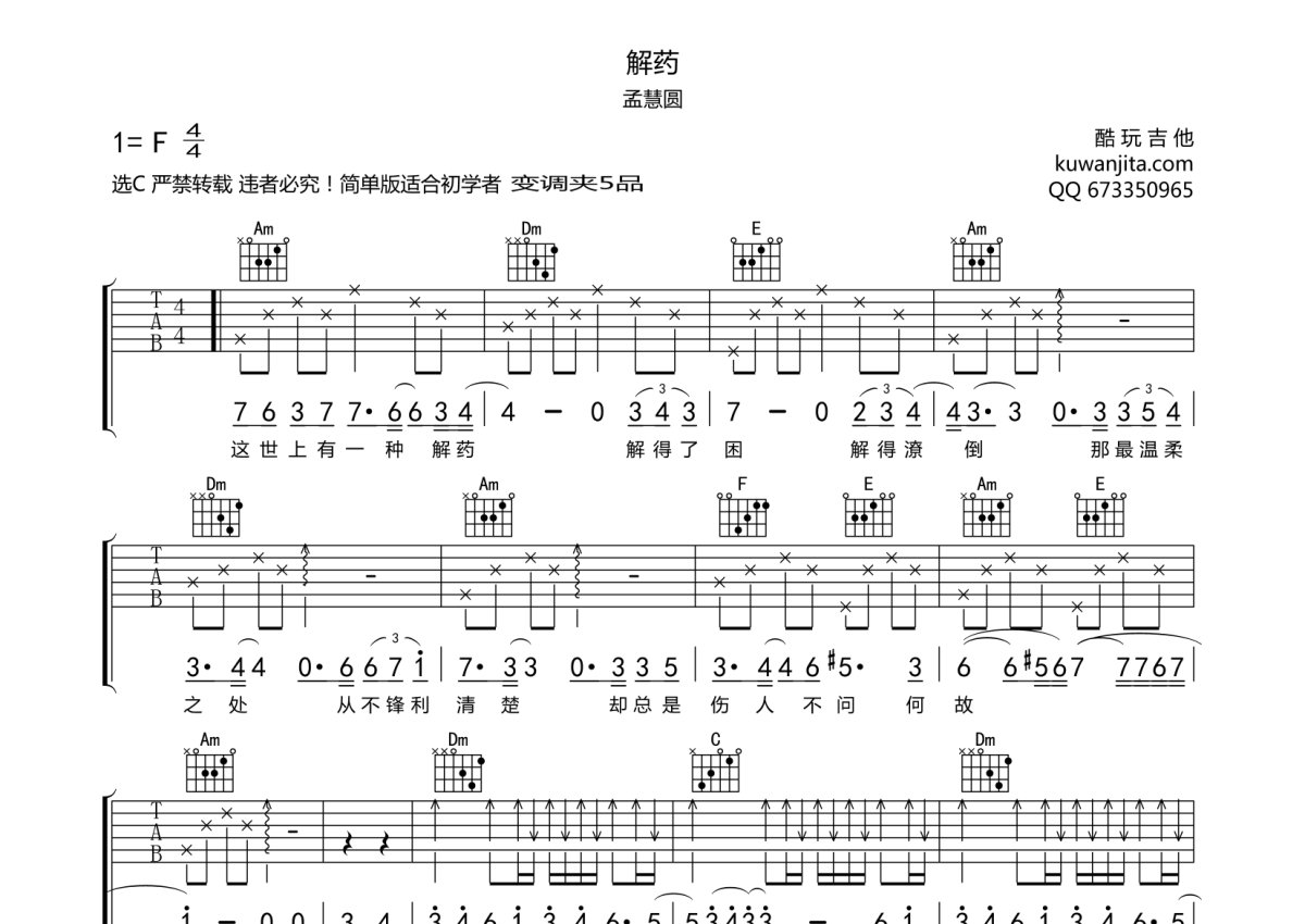 孟慧圆《解药》吉他谱 - C调弹唱六线谱