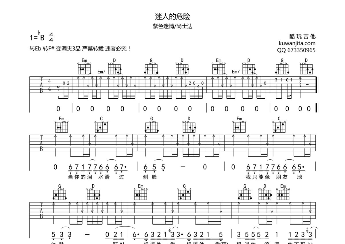 《迷人的危险》是尚士达/紫色情迷演唱的一首歌曲,本吉他谱采用的是G调指法编配,这份吉他谱共有三张高清图谱,图谱由 @酷玩吉他 编配上传,图谱使用六线谱编配,包含吉他和弦指法、简谱以及歌词部分,使用这份迷人的危险吉他谱,可以让你更加方便地掌握这首歌曲的弹唱技巧,快来尝试吧。尚士达/紫色情迷《迷人的危险》吉他谱_G调吉他弹唱谱。