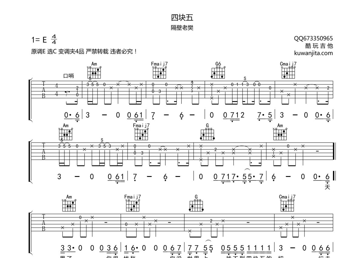 隔壁老樊《四块五》吉他谱 - C调弹唱六线谱