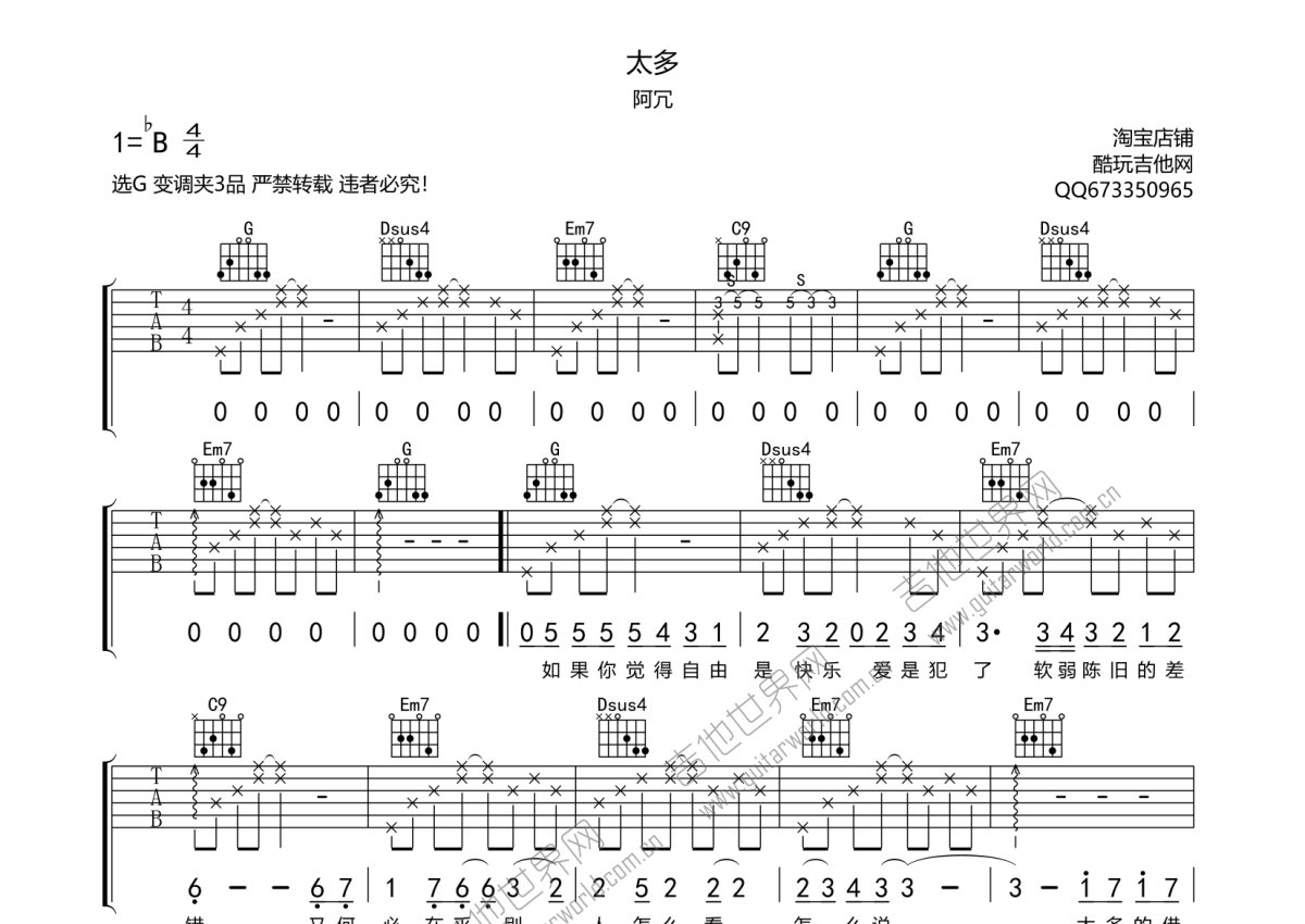 阿冗《太多》吉他谱 - G调弹唱六线谱