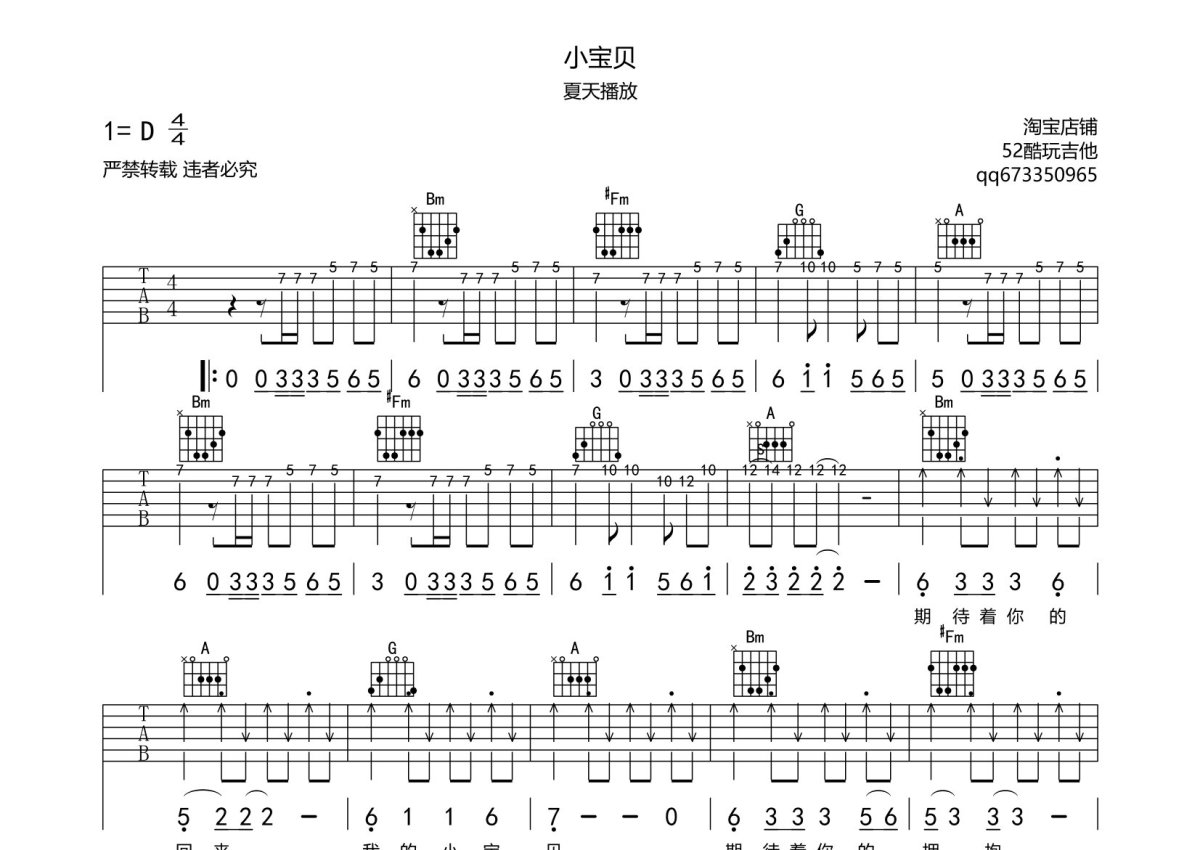 夏天播放《小宝贝》吉他谱 - D调弹唱六线谱