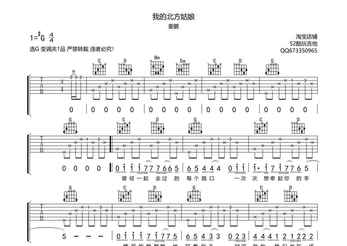 姜鹏《我的北方姑娘》吉他谱 - G调弹唱六线谱