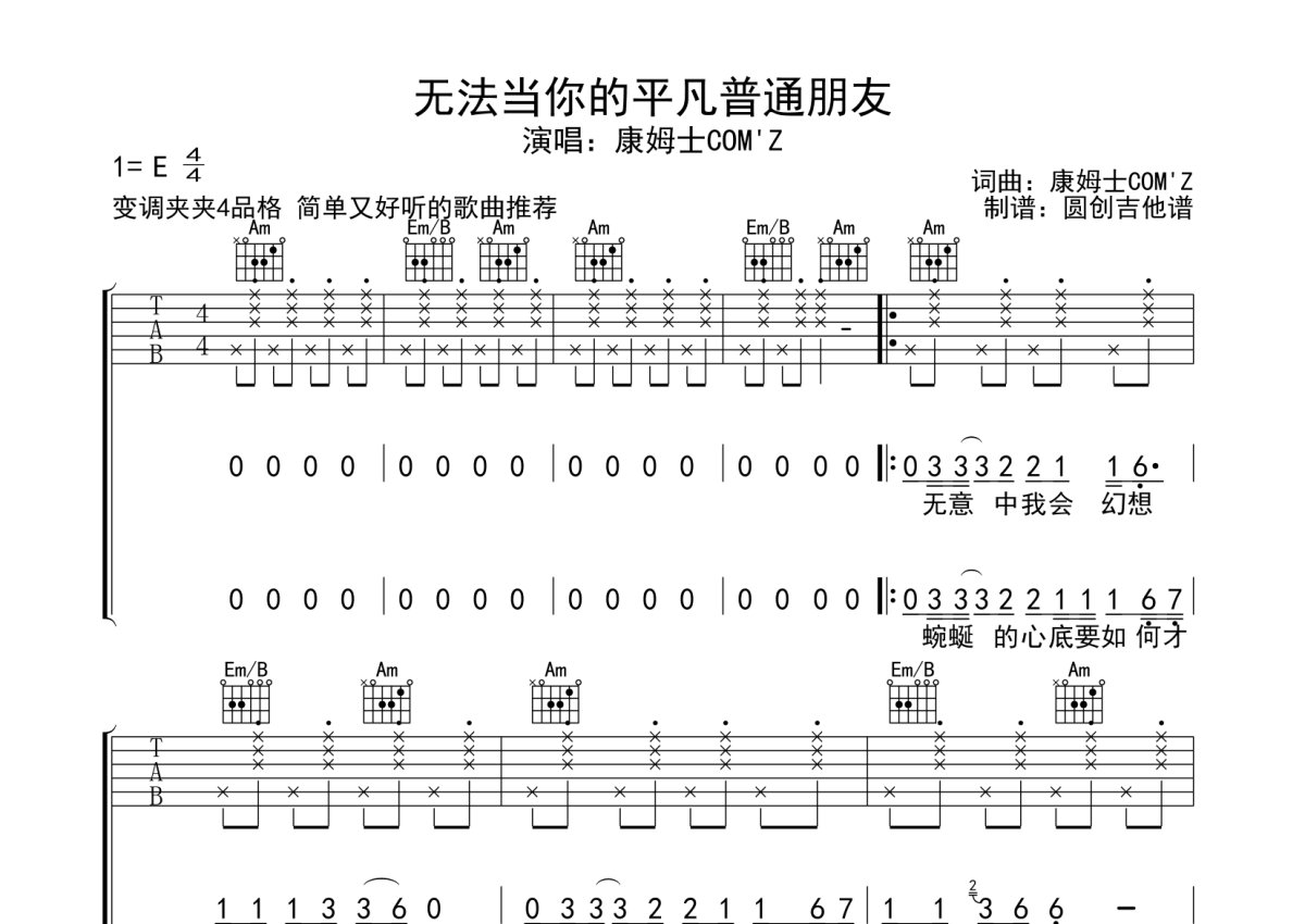 《无法当你的平凡普通朋友》是康姆士演唱的一首歌曲,分解加扫弦编配原版编配,本吉他谱采用的是C调指法编配,这份吉他谱共有四张高清图谱,图谱由 @圆创吉他谱 编配上传,图谱使用六线谱编配,包含吉他和弦指法、简谱以及歌词部分,曲谱配备了相关的音频提供试听,使用这份无法当你的平凡普通朋友吉他谱,可以让你更加方便地掌握这首歌曲的弹唱技巧,快来尝试吧。