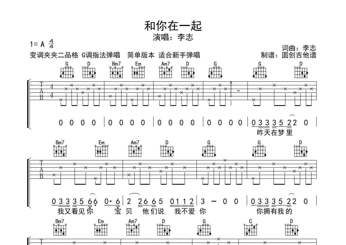 《和你在一起》是李志演唱的一首歌曲,分解简单编配,本吉他谱采用的是A调指法编配,这份吉他谱共有三张高清图谱,图谱由 @圆创吉他谱 编配上传,图谱使用六线谱编配,包含吉他和弦指法、简谱以及歌词部分,曲谱配备了相关的音频提供试听,使用这份和你在一起吉他谱,可以让你更加方便地掌握这首歌曲的弹唱技巧,快来尝试吧。非常适合新手弹唱的歌曲 简单和弦 简单节奏型 推荐收藏练习哦。
