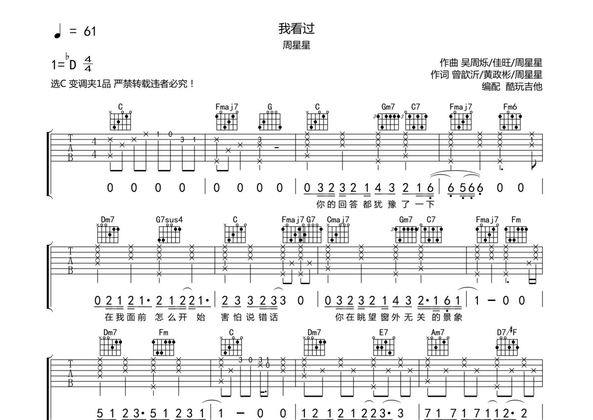 周星星《我看过》吉他谱 - C调弹唱六线谱