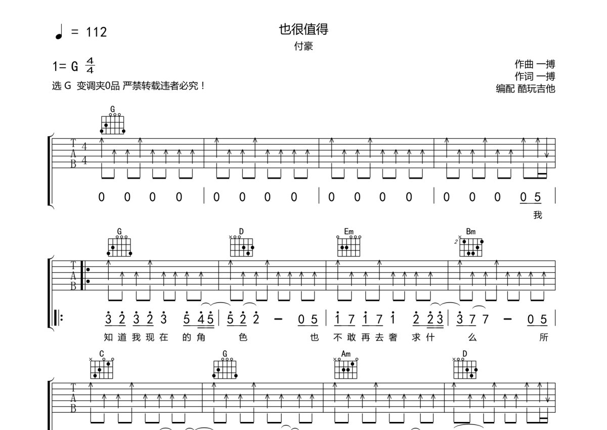 付豪《也很值得》吉他谱 - G调弹唱六线谱