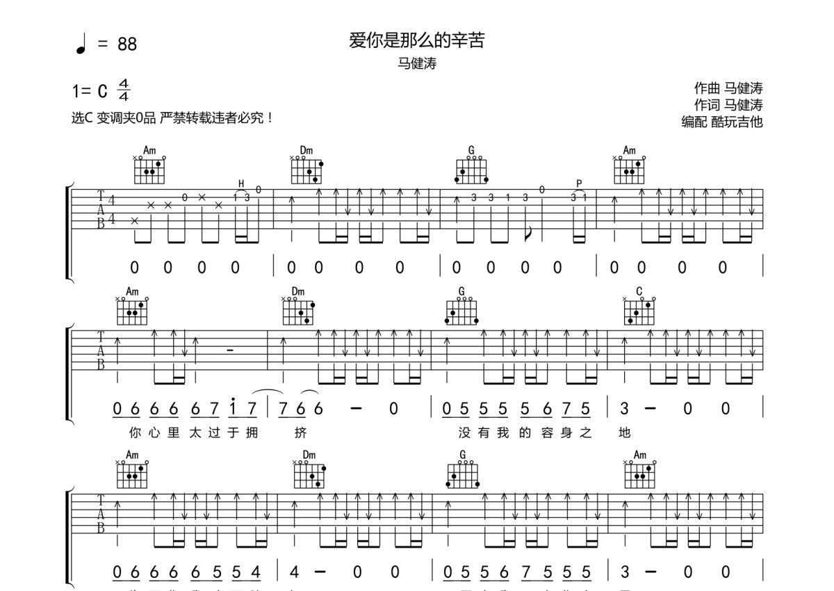 马健涛《爱你是那么的辛苦》吉他谱 - C调弹唱六线谱