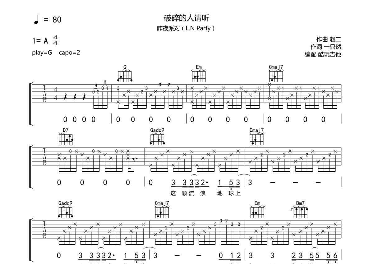 昨夜派对《破碎的人请听》吉他谱 - G调弹唱六线谱