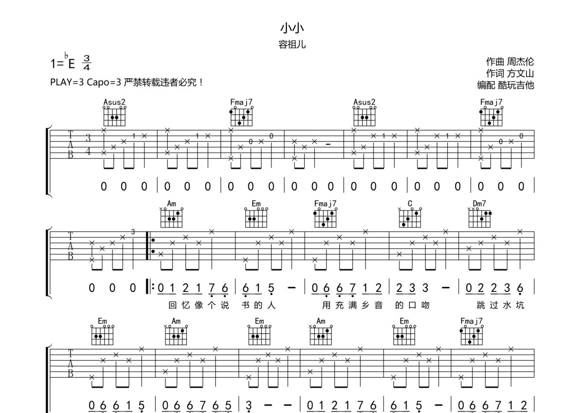 《小小》是容祖儿演唱的一首歌曲,本吉他谱采用的是C调指法编配,这份吉他谱共有三张高清图谱,图谱由 @酷玩吉他 编配上传,图谱使用六线谱编配,包含吉他和弦指法、简谱以及歌词部分,曲谱配备了相关的音频提供试听,使用这份小小吉他谱,可以让你更加方便地掌握这首歌曲的弹唱技巧,快来尝试吧。容祖儿《小小》吉他谱-C调弹唱谱完整高清原版。