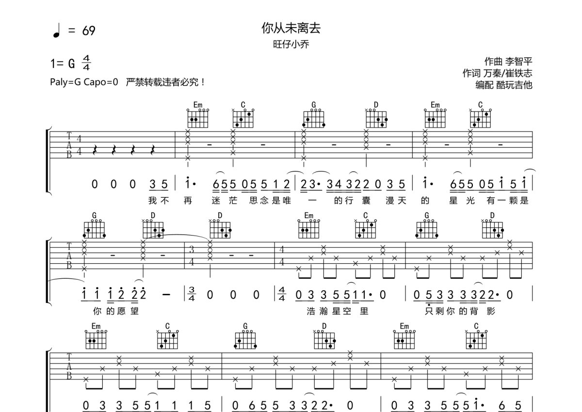 旺仔小乔《你从未离去》吉他谱 - G调弹唱六线谱