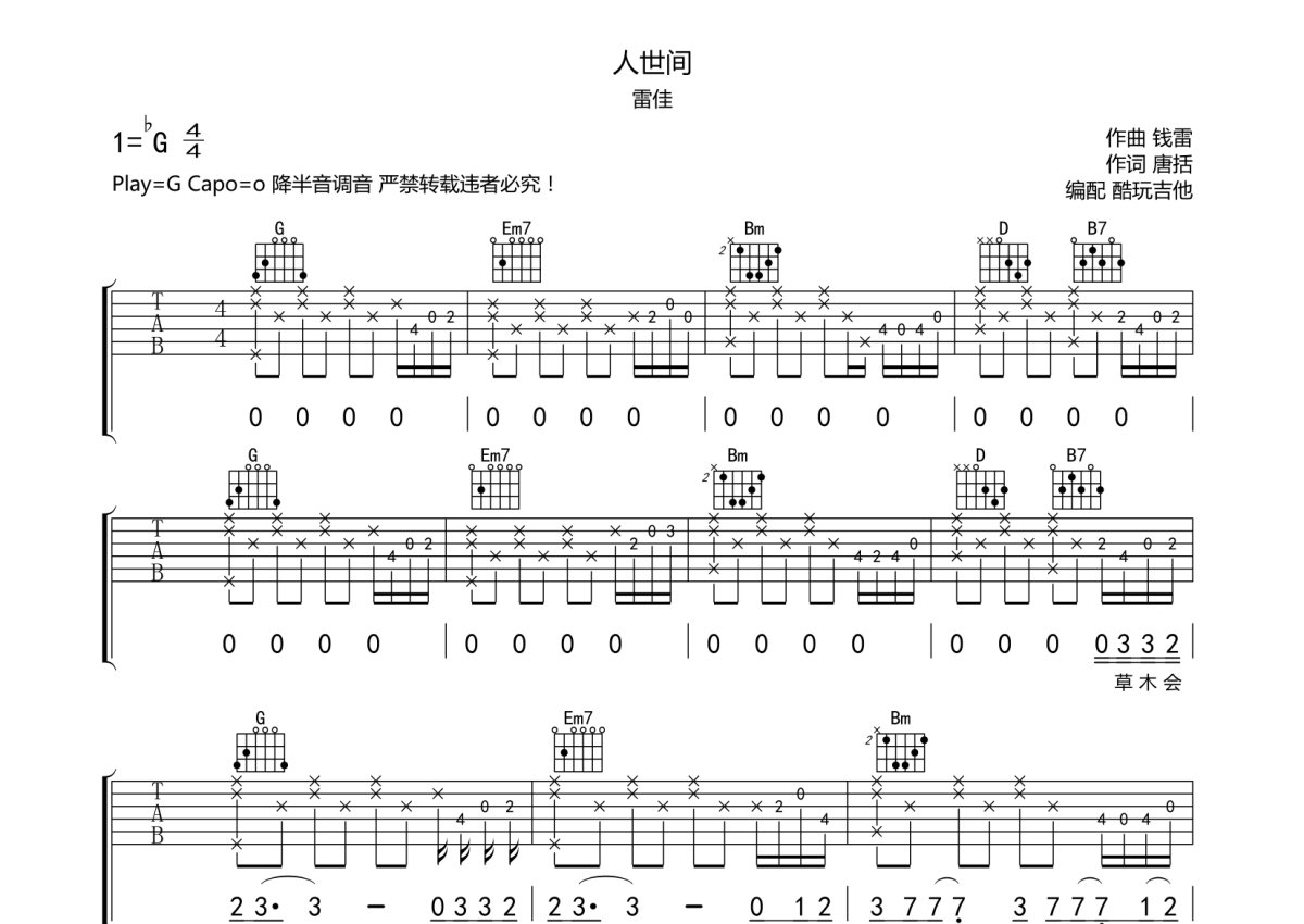 雷佳《人世间》吉他谱 - G调弹唱六线谱
