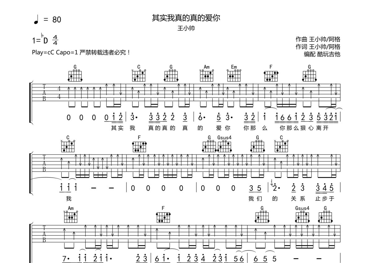 王小帅/阿格《其实我真的真的爱你》吉他谱 - C调弹唱六线谱