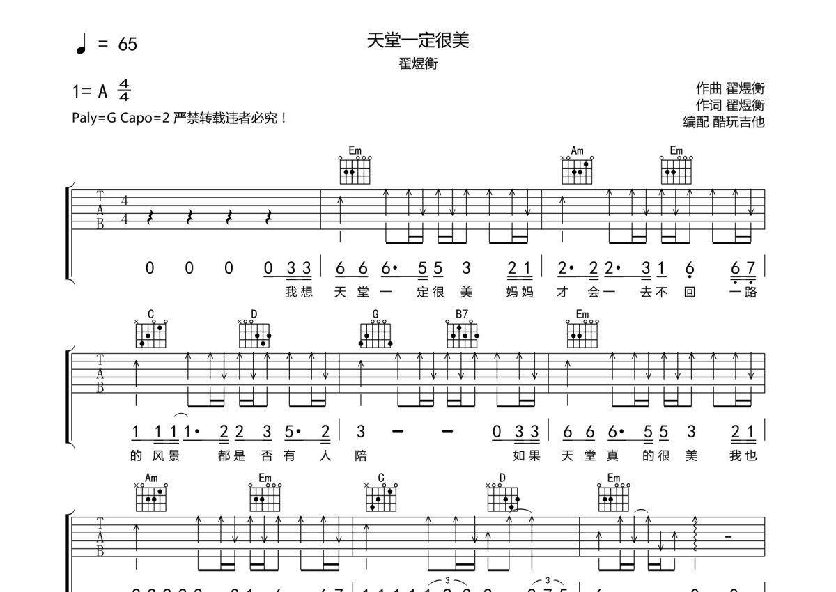 翟煜衡《天堂一定很美》吉他谱 - G调弹唱六线谱