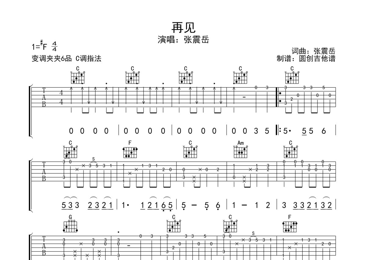 张震岳《再见》吉他谱 - C调独奏六线谱