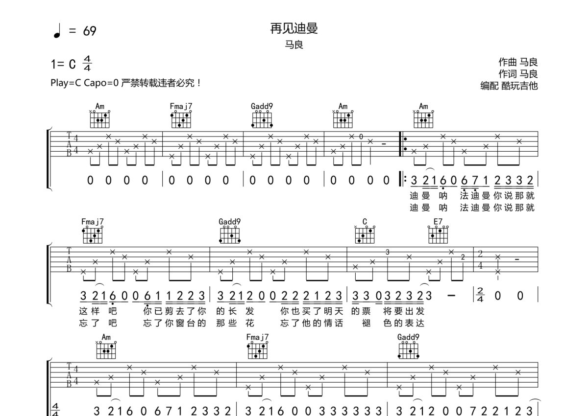 马良《再见迪曼》吉他谱 - C调弹唱六线谱