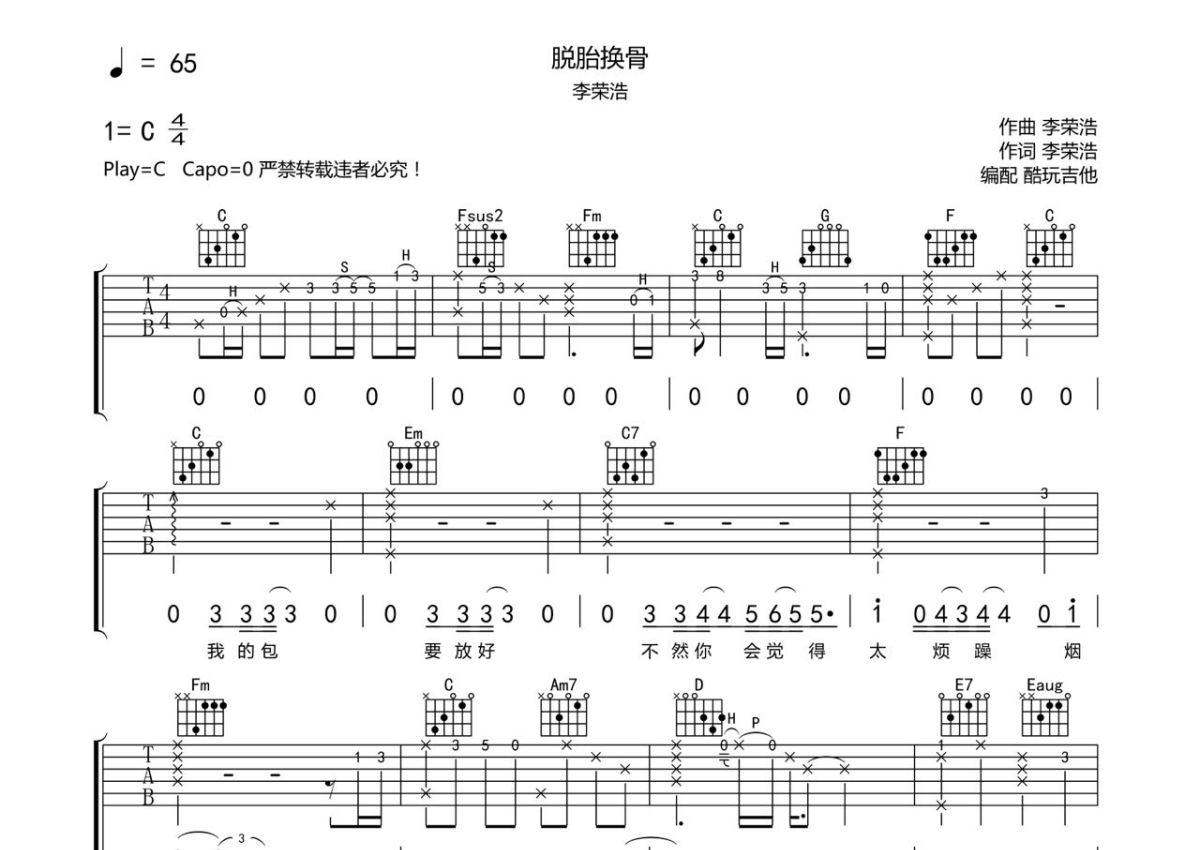 李荣浩《脱胎换骨》吉他谱 - C调弹唱六线谱