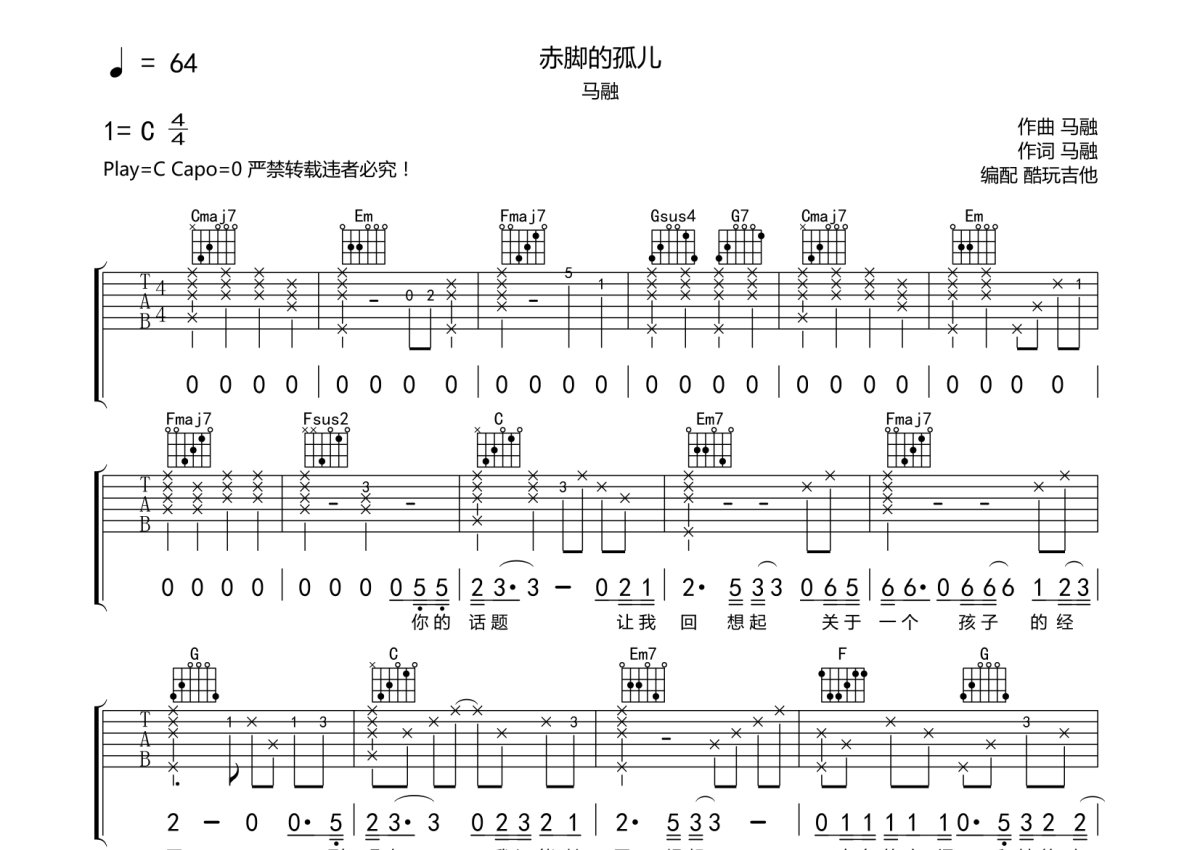 马融《赤脚的孤儿》吉他谱 - C调弹唱六线谱