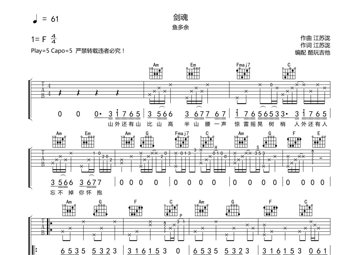 鱼多余《剑魂》吉他谱 - C调弹唱六线谱
