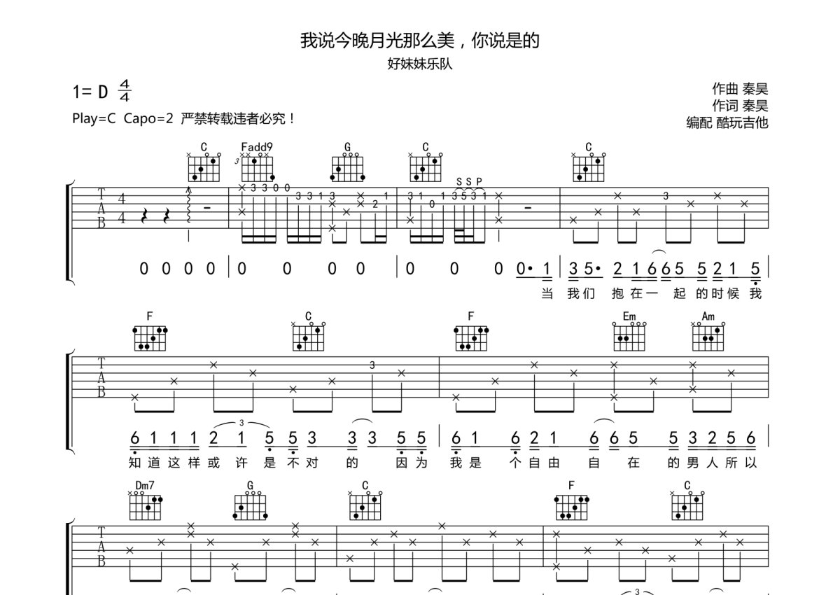 好妹妹《我说今晚月光那么美,你说是的》吉他谱 - C调弹唱六线谱