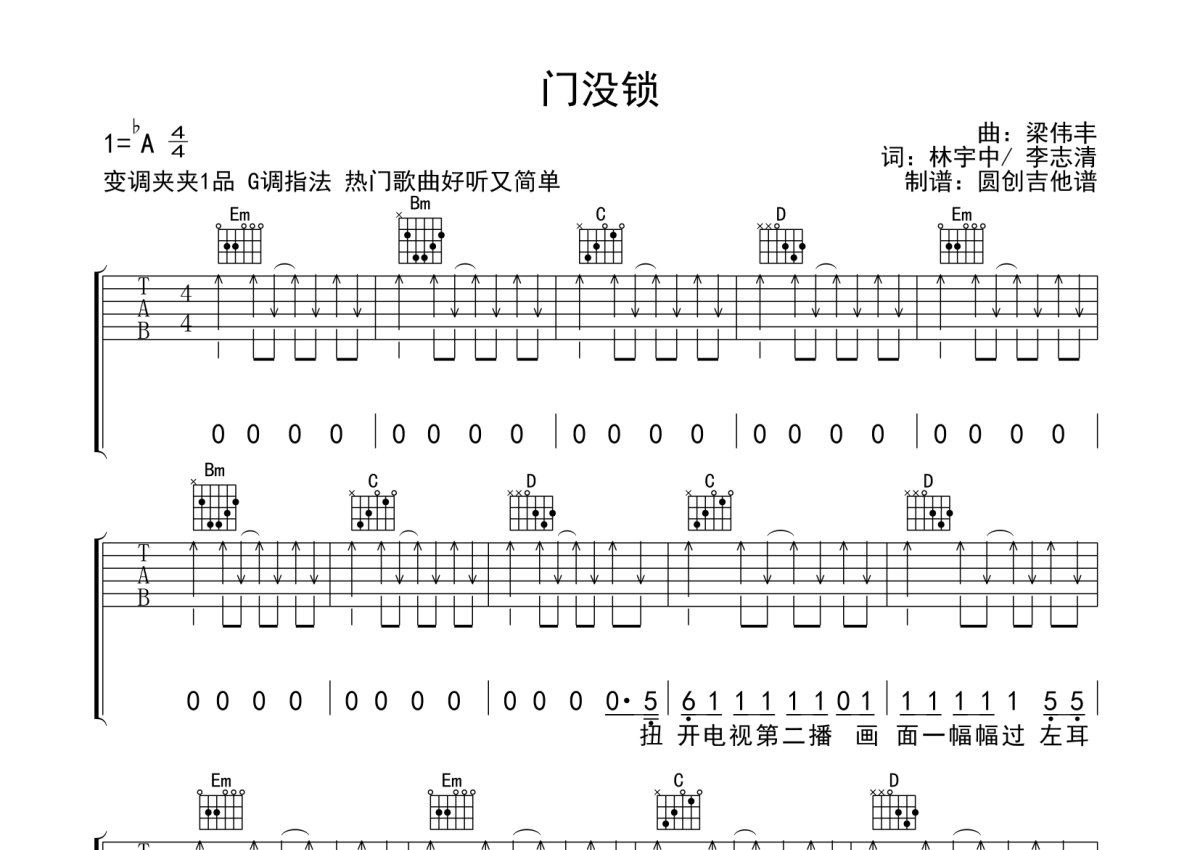 品冠《门没锁》吉他谱 - G调弹唱六线谱 - 扫弦编配原版编配