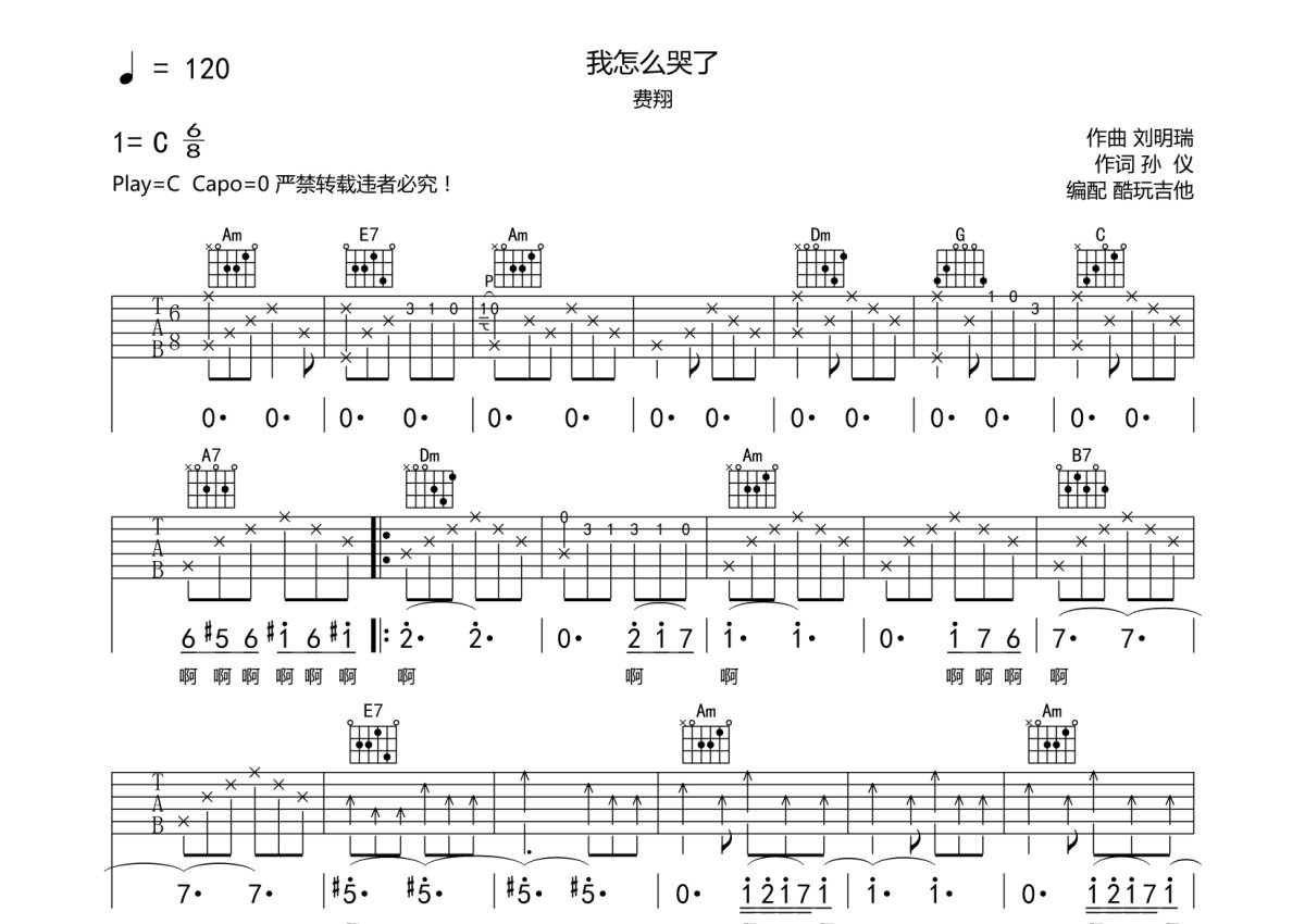 《我怎么哭了》是费翔演唱的一首歌曲,本吉他谱采用的是C调指法编配,这份吉他谱共有两张高清图谱,图谱由 @酷玩吉他 编配上传,图谱使用六线谱编配,包含吉他和弦指法、简谱以及歌词部分,曲谱配备了相关的音频提供试听,使用这份我怎么哭了吉他谱,可以让你更加方便地掌握这首歌曲的弹唱技巧,快来尝试吧。费翔《我怎么哭了》吉他谱-C调弹唱谱高清原版谱;。