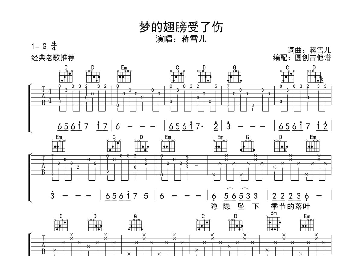 蒋雪儿《梦的翅膀受了伤》吉他谱 - G调弹唱六线谱 - 分解加扫弦编配原版编配