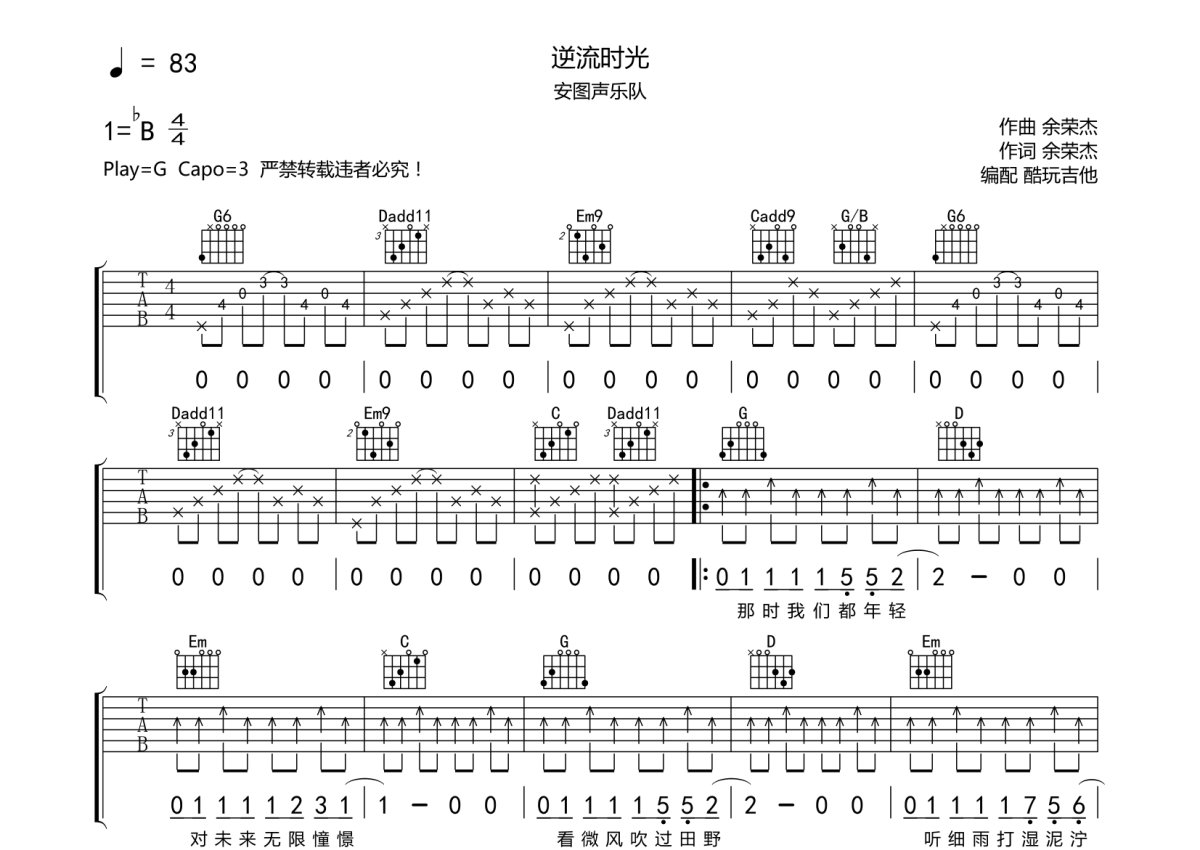 安图声院队《逆流时光》吉他谱 - G调弹唱六线谱