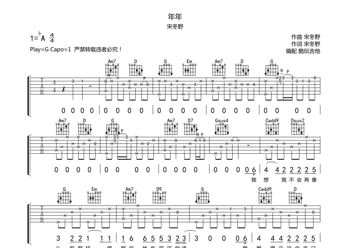 宋冬野《年年》吉他谱 - G调弹唱六线谱