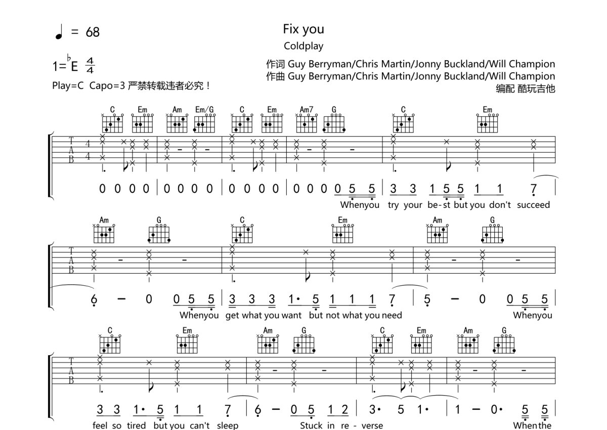 Coldplay《Fix You》吉他谱 - C调弹唱六线谱