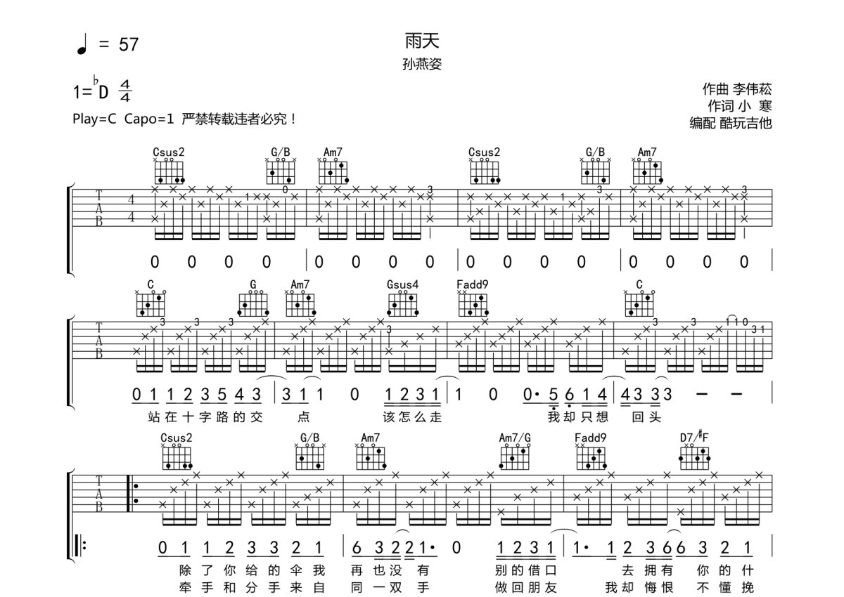 孙燕姿《雨天》吉他谱 - C调弹唱六线谱
