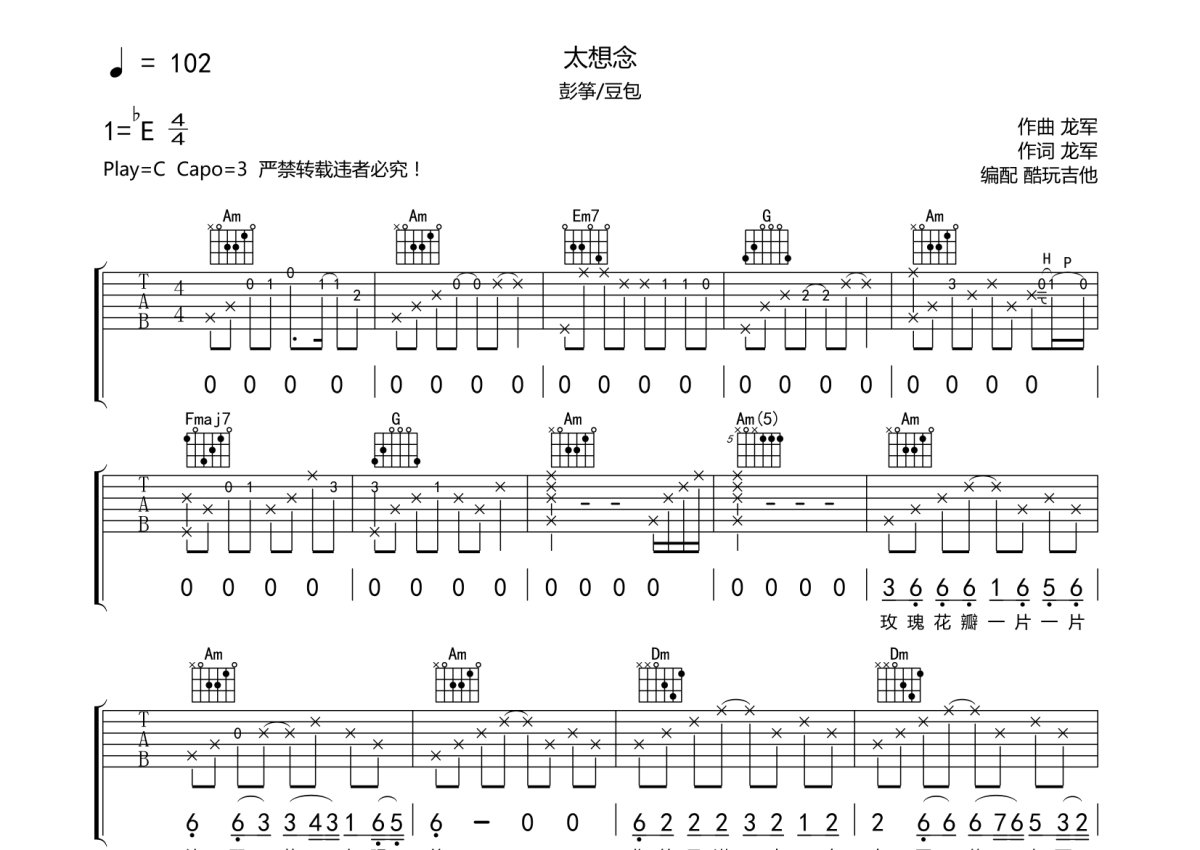 彭筝/豆包《太想念》吉他谱 - C调弹唱六线谱