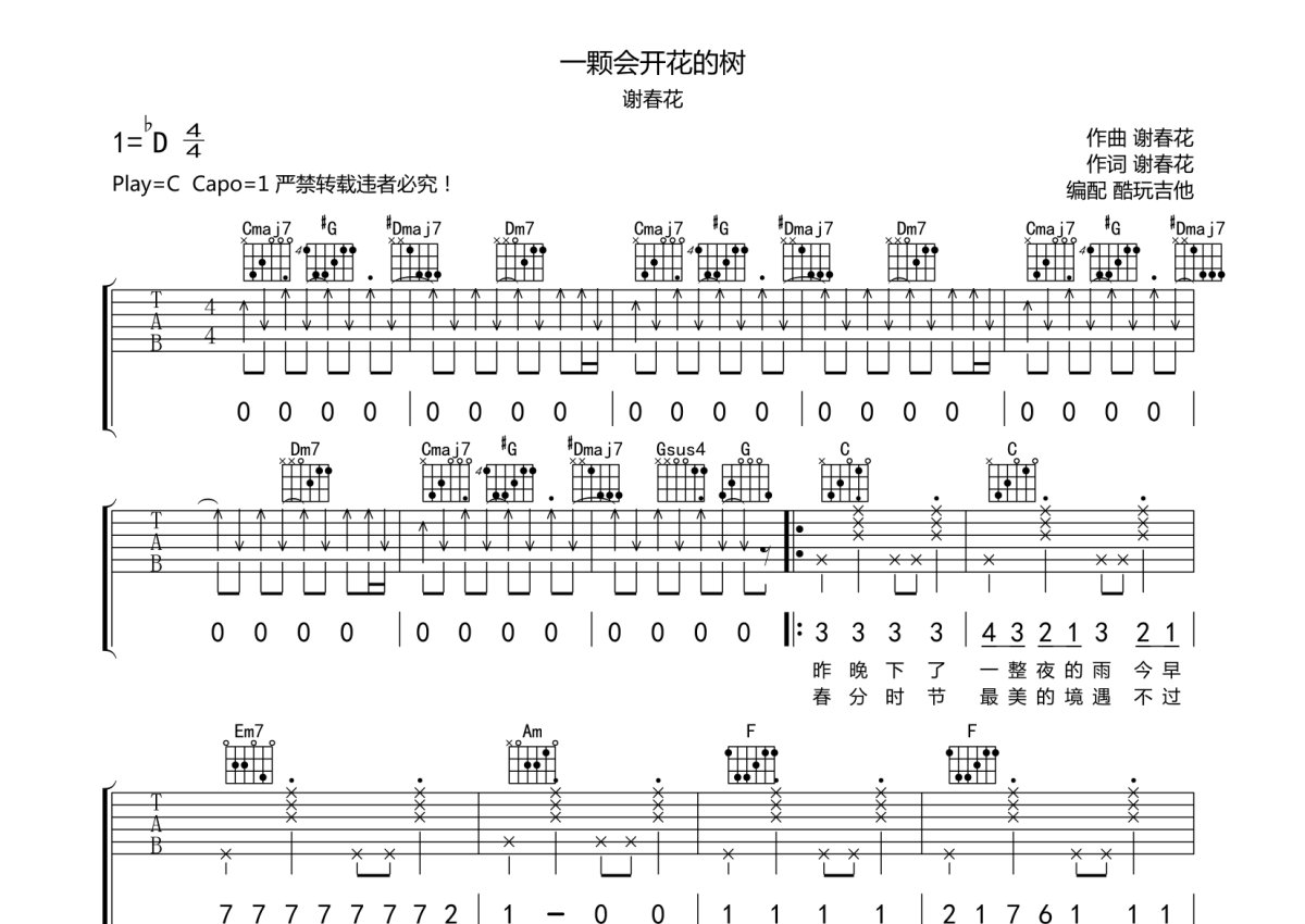 谢春花《一颗会开花的树》吉他谱 - C调弹唱六线谱