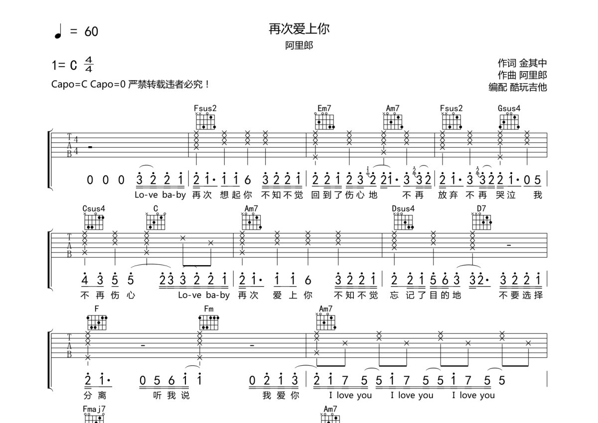 《再次爱上你》是WIFI歪歪演唱的一首歌曲,本吉他谱采用的是C调指法编配,这份吉他谱共有两张高清图谱,图谱由 @酷玩吉他 编配上传,图谱使用六线谱编配,包含吉他和弦指法、简谱以及歌词部分,曲谱配备了相关的音频提供试听,使用这份再次爱上你吉他谱,可以让你更加方便地掌握这首歌曲的弹唱技巧,快来尝试吧。WIFI歪歪《再次爱上你》吉他谱-C调弹唱谱高清原版谱 。