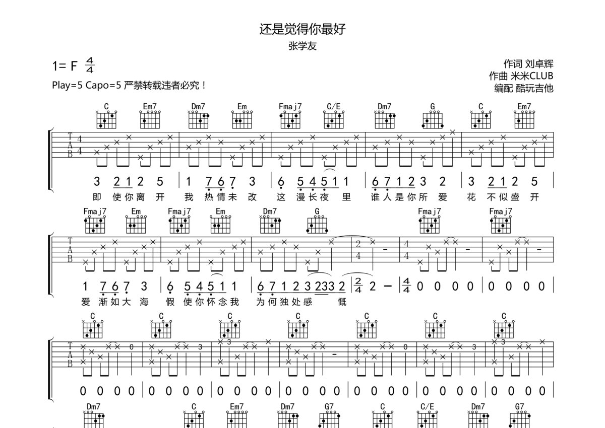 张学友《还是觉得你最最好》吉他谱 - C调弹唱六线谱