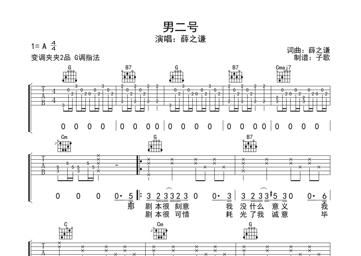薛之谦《男二号》吉他谱 - G调弹唱六线谱