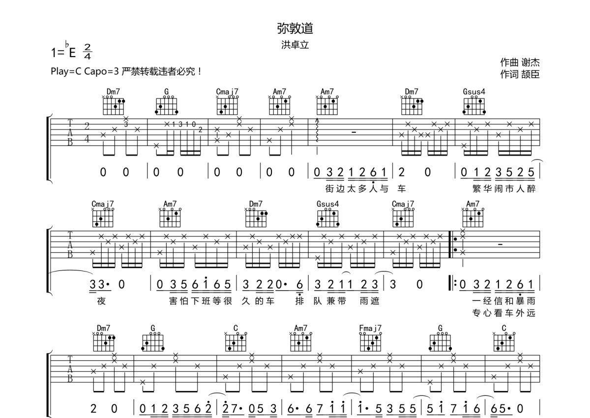 洪卓立《弥敦道》吉他谱 - C调弹唱六线谱