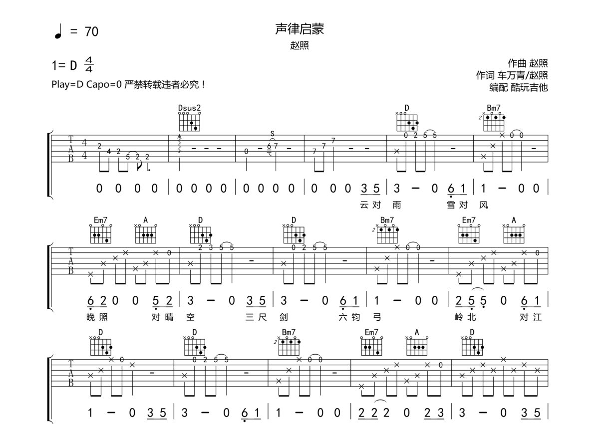 赵照《声律启蒙》吉他谱 - D调弹唱六线谱