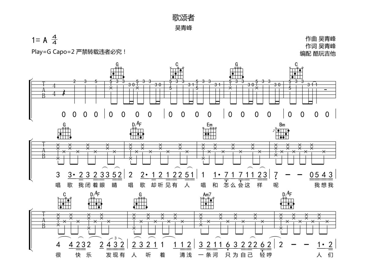 吴青峰《歌颂者》吉他谱 - G调弹唱六线谱