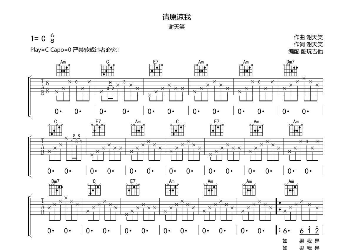 谢天笑《请原谅我》吉他谱 - C调弹唱六线谱
