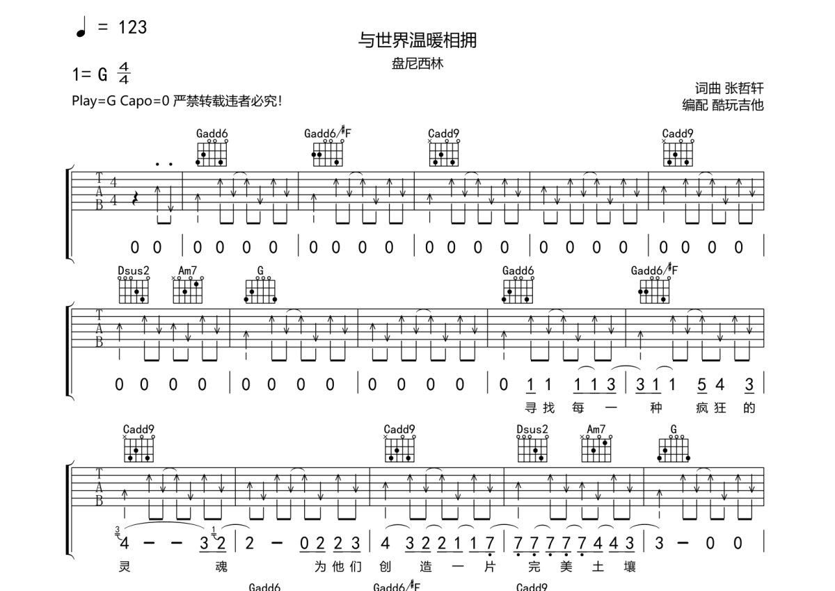 《与世界温暖相拥》是盘尼西林演唱的一首歌曲,本吉他谱采用的是G调指法编配,这份吉他谱共有三张高清图谱,图谱由 @酷玩吉他 编配上传,图谱使用六线谱编配,包含吉他和弦指法、简谱以及歌词部分,曲谱配备了相关的音频提供试听,使用这份与世界温暖相拥吉他谱,可以让你更加方便地掌握这首歌曲的弹唱技巧,快来尝试吧。