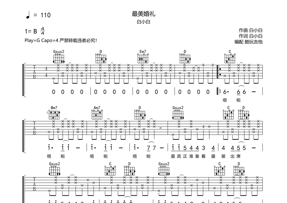 白小白《最美婚礼》吉他谱 - G调弹唱六线谱