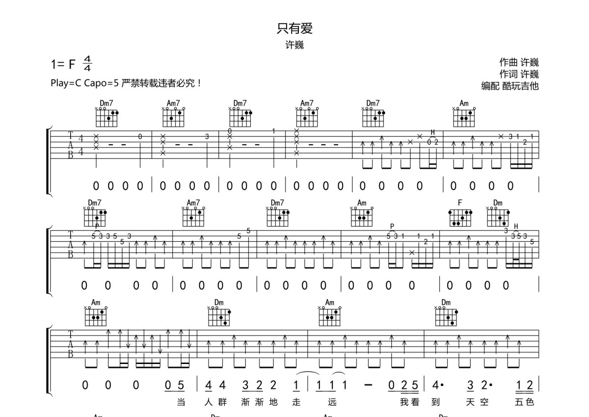 许巍《只有爱》吉他谱 - C调弹唱六线谱