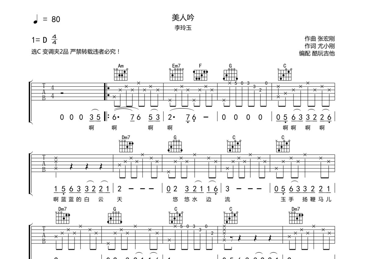 《美人吟》是李玲玉演唱的一首歌曲,本吉他谱采用的是C调指法编配,这份吉他谱共有两张高清图谱,图谱由 @酷玩吉他 编配上传,图谱使用六线谱编配,包含吉他和弦指法、简谱以及歌词部分,曲谱配备了相关的音频提供试听,使用这份美人吟吉他谱,可以让你更加方便地掌握这首歌曲的弹唱技巧,快来尝试吧。李玲玉《美人吟》吉他谱-C调弹唱谱 。