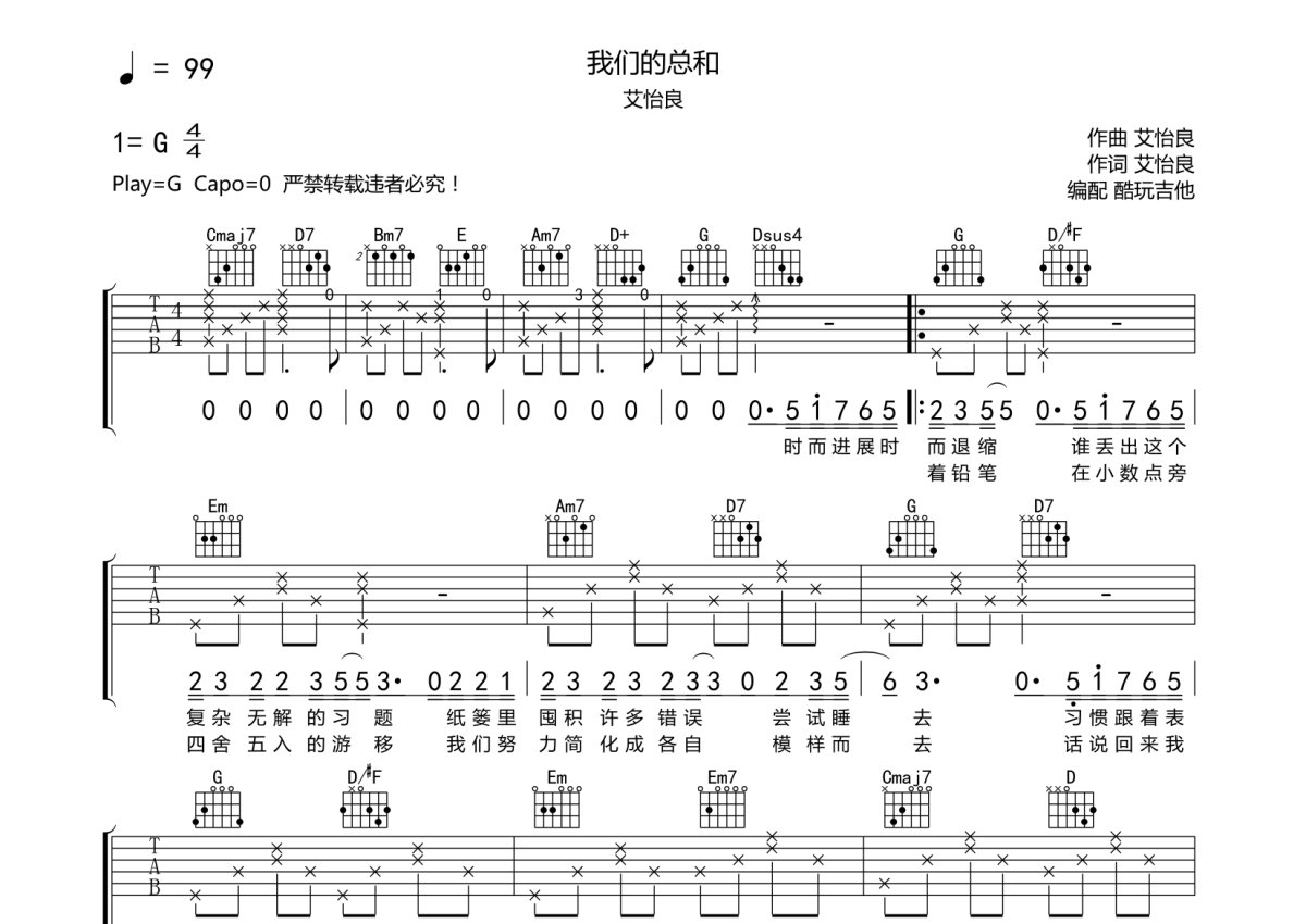 艾怡良《我们的总和》吉他谱 - G调弹唱六线谱