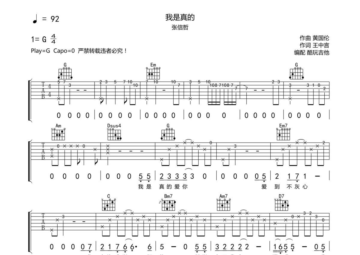 张信哲《我是真的》吉他谱 - G调弹唱六线谱