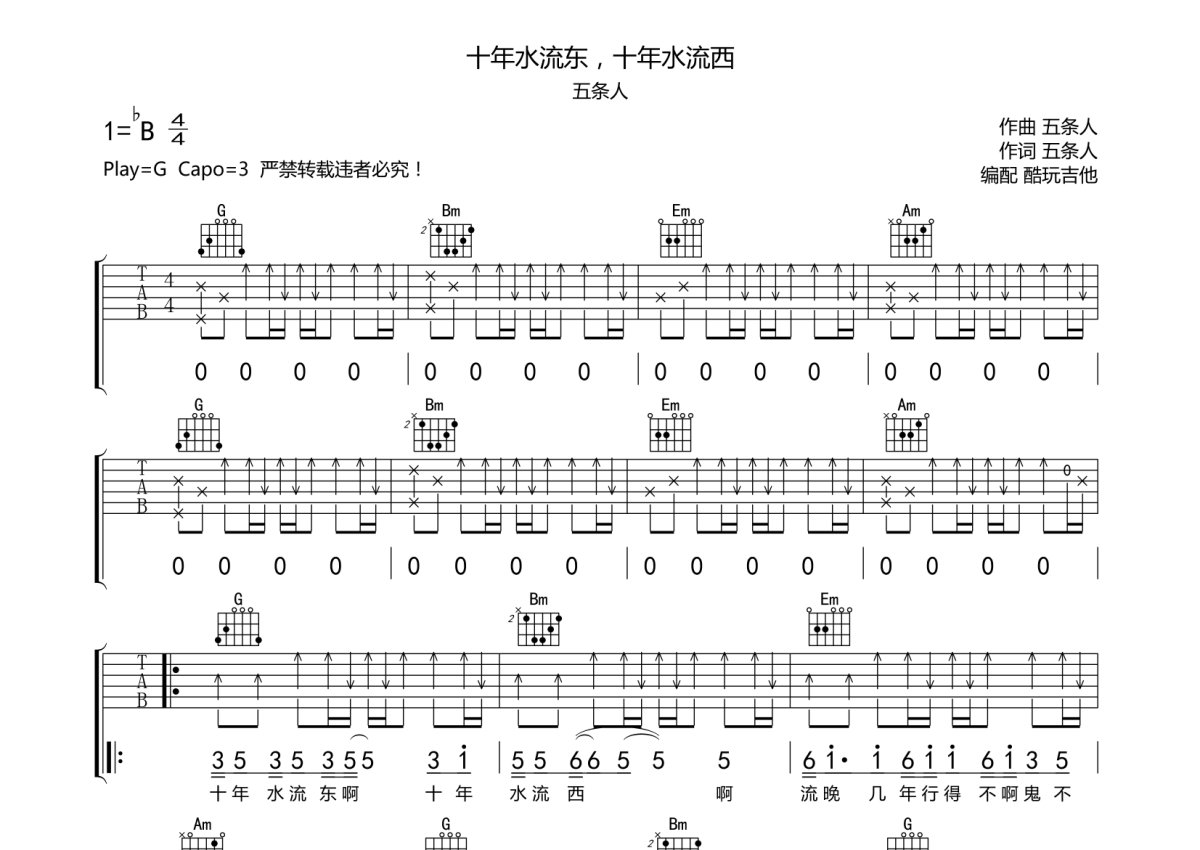 五条人《十年水流东,十年水流西》吉他谱 - G调弹唱六线谱